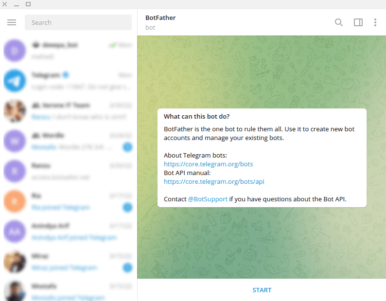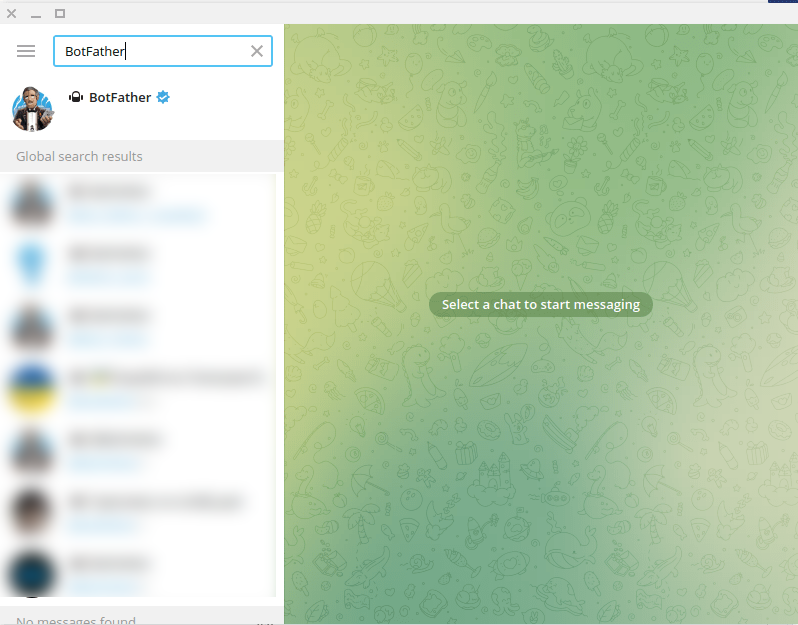 To build a Telegram bot with AgentsAsset, first, open your Telegram App. Then in the search bar of the app, search with the ‘BotFather’ keyword. Then select the verified BotFather account.